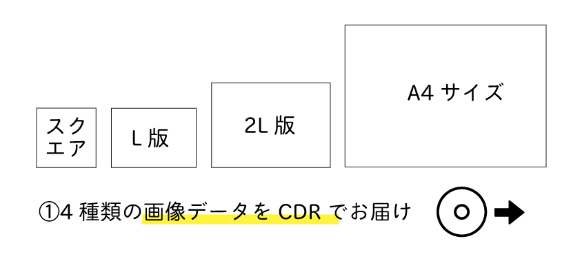このオプションを一緒に購入いただくと!SNS用のスクエアサイズに加え、L版、2L版、A4サイズが追加!CDRにして郵送します。自宅で印刷したり、カメラのキタムラにCDRを持っていき印刷できます♪